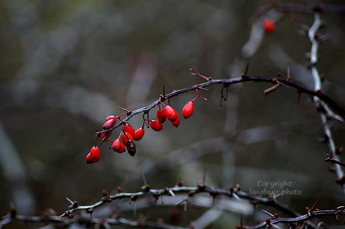 1. Ja visst finns färgklickarna där och visst är det en rolig utmaning till sig själv att försöka hitta dom. Färger lyser ju extra starkt när allt i övrigt är grått. Berberisen, vilken glädje att se den lysa som ett stoppljus! Det gröna med kotten med sin mjuka och behagliga bakgrund. Och så vassen, den bilden tycker jag mycket om. Mycket för ljuset i bakgrunden, det så sällsynta den här årstiden men ack så viktigt att ta vara på när det äntligen finns där.