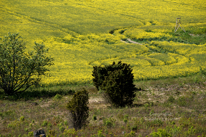 På nyheterna härom dagen berättade de om att folk är som galna och ska in i rapsfälten för att ta selfies…! hm… så de hade varit tvungna att sätta upp stoppskyltar, för man får ju inte lov att kliva runt i fälten, eller, som någon visst också hade gjort, kört in med motorcykel! Nä, någon måtta på det får det väl ändå vara! 🙂 Det går ju precis lika bra att fotografera vid sidan om! Nu vet jag inte om just de här spåren som syns här är från någon som skulle ta selfies, kanske inte, men det är ju tur att man inte har det behovet i alla fall 🙂