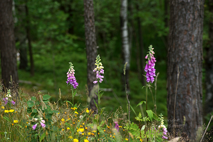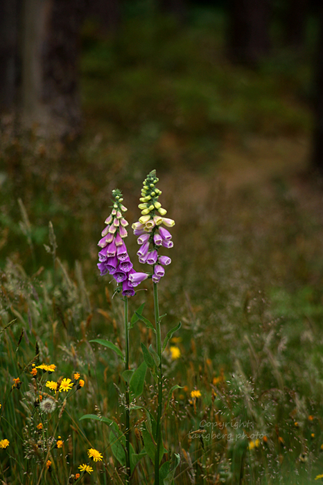 Det är fingerborgsblommornas tid nu, här står de i en skogsbacke.