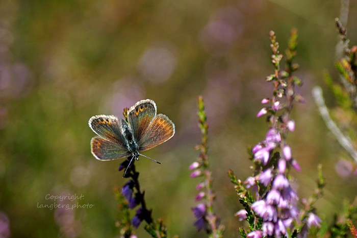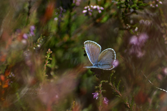 Äntligen har jag sett och fotograferat blåvingar! Ljungen slår ut och då hittar man dem ofta där. Uppe på ljungheden i Änggårdsbergen fladdrar det blåvingar hela tiden över ljungen.