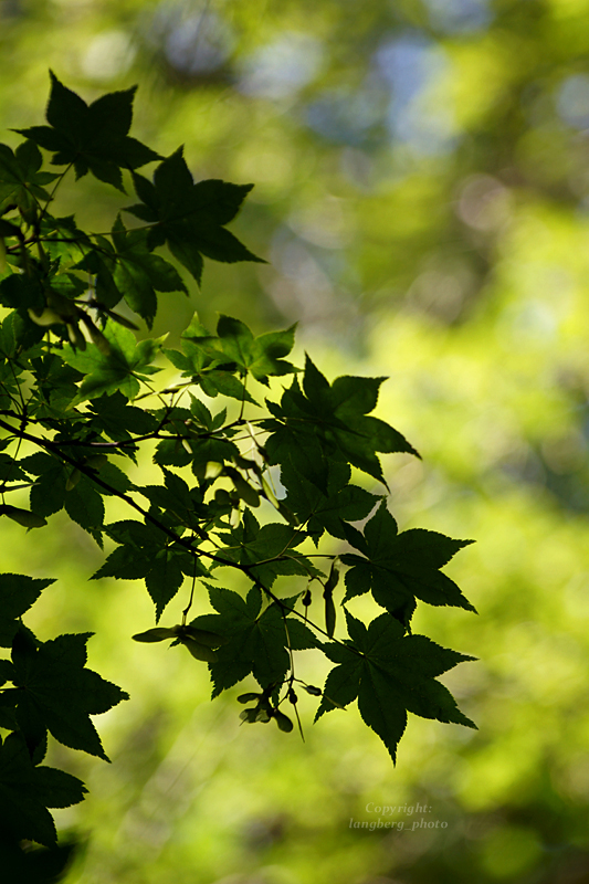 Och så gick vi ju, så klart, förbi de japanska lönnarna. De står nära Finnsmossen. De var gröna och fina ännu, fast här blev bladen mörka i motljuset.