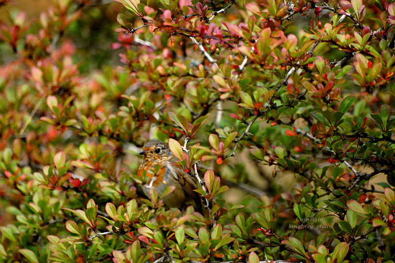 Ser du rödhaken? Väl kamoflerad i berberisbusken