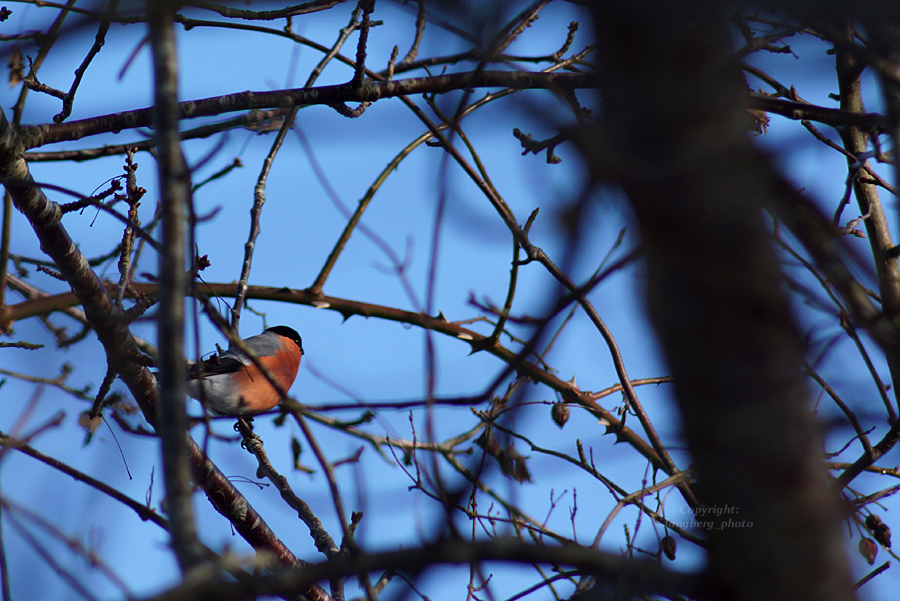 På en promenad till havet i veckan så såg jag en domherre. Bilden är beskuren för den satt lite för långt bort för mitt lilla teleobjektiv. Men roligt att se den.