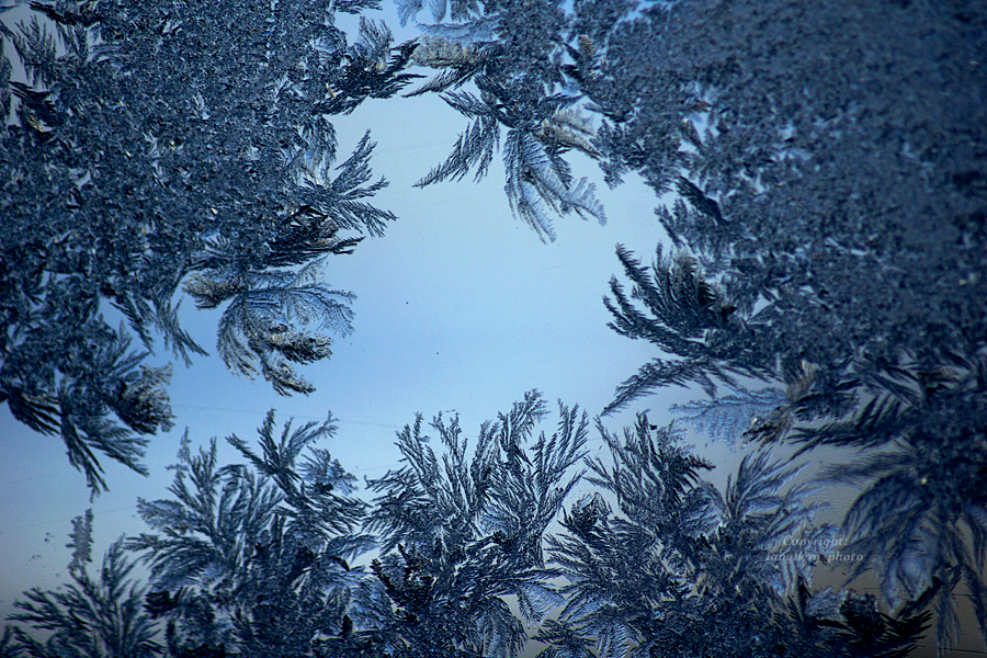 2. Jag tänkte på det i dag, att det är på landet det bildas frost på bilrutorna, här i stan står bilen i garaget och då blir det inget. Får beundra dina fina. Den översta blå bilden är fantastiskt vacker, ser ut som en skog med vajande grenar. Och den nedersta bilden med snöklädda klippor och is, den andas skönhet och lugn.