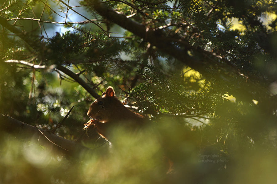 En liten ekorre avslöjade sig för mig genom ett ”skala-kotte-ljud” som jag hörde inifrån granen. Den satt lite svåråtkomligt till, men det syns ju att det är en ekorre i alla fall 🙂
