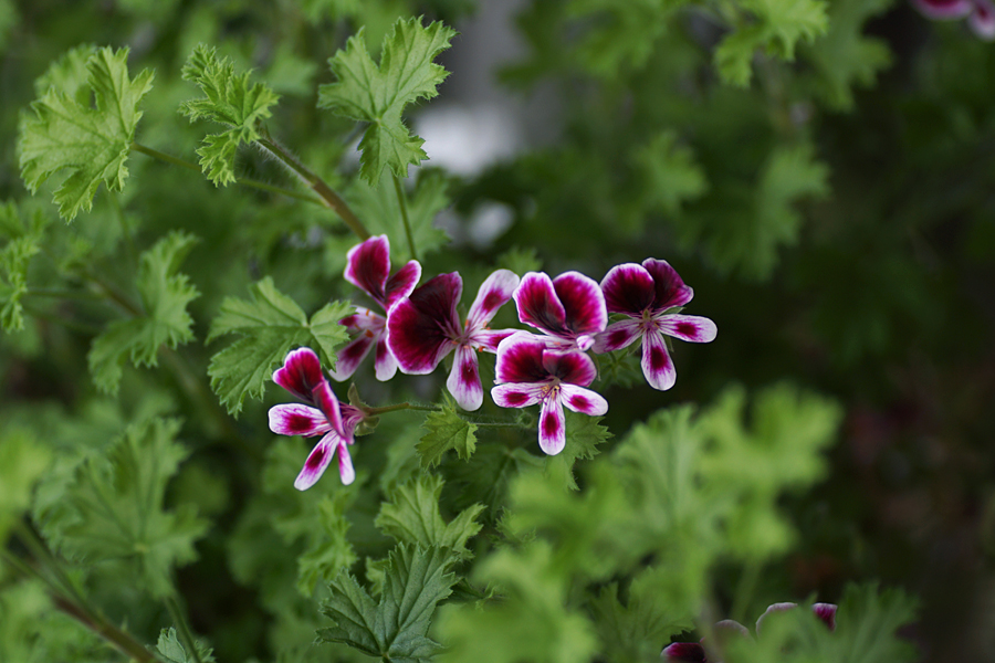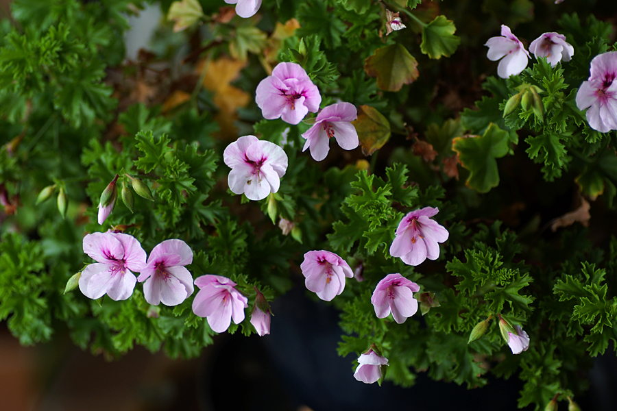 Mina änglapelargoner blommar fortfarande. Den ena har stått ute på balkongen ända fram till idag och den andra har stått i uterummet ett tag. Lite tilltufsade är de men väldigt blomrika.