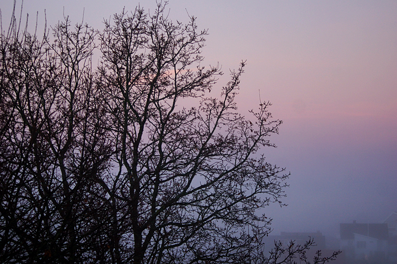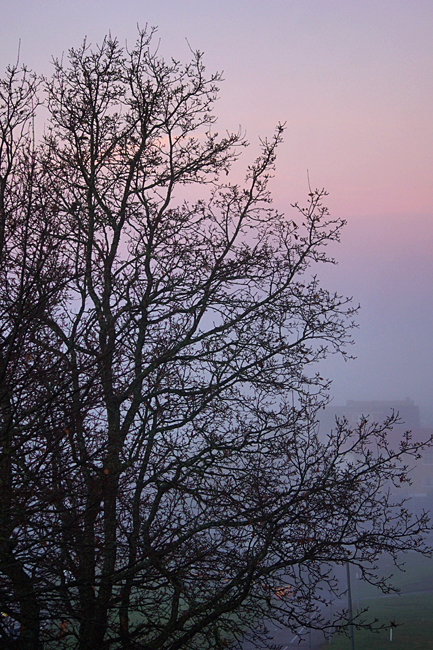 Först trodde jag det bara var en grå och trist morgon med dimma. Men sen såg jag att himlen började skifta i rosa och ljuset blev annorlunda. Då hämtade jag kameran, så klart. Kanske t.o.m solen visar sig så småningom. 😀