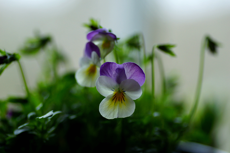 Jag tycker väldigt mycket om de här små violpenséerna. De är mest lika de vilda styvmorsviolerna. Och så tål de en aning frost. Jag har planterat ut en liten låda med minipåskliljor och violpenséer på framsidan, utanför köksfönstret, som jag kan titta på från köksbordet. Den är lätt att flytta in om det skulle bli alltför kallt.