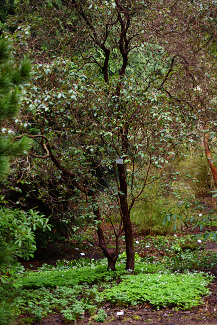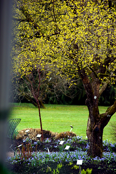 När vi hade gått denna härliga runda så tog vi en fika inne på caféet. Då fick jag syn på detta motivet som är taget genom fönstret. Det gråa i vänsterkanten är en gardin. Och trädet är en Trollhassel i full blom.
