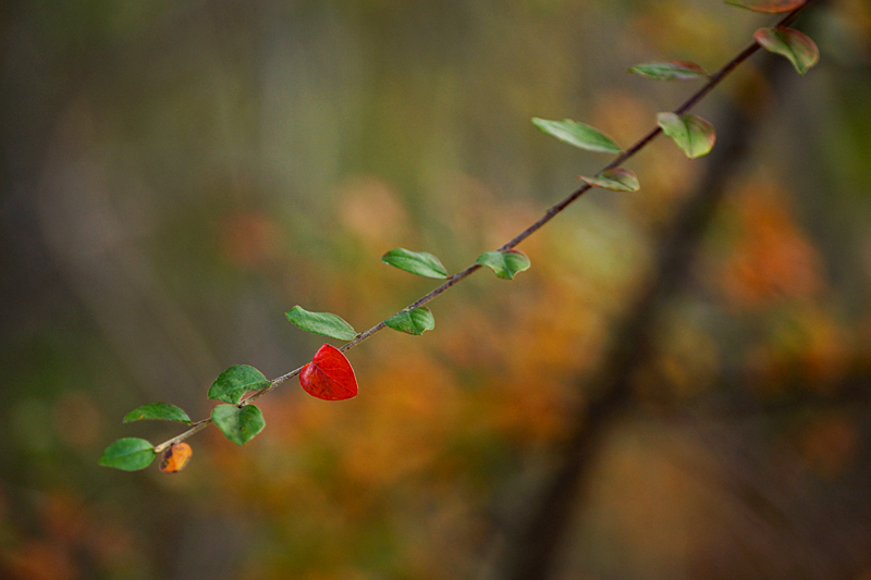 Ett blad har färgats rött på denna berberisgren.