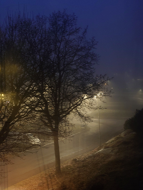 Denna bilden är tagen en dimmig kväll, inifrån uterummet och ner mot vägen. Här speglar sig allt möjligt i fönstren av det som finns i uterummet.