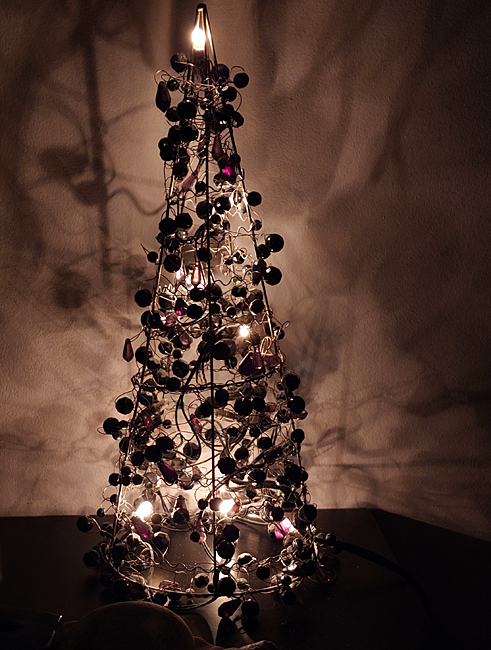Den här lysande granen köpte vi för flera år sedan. Jag tycker den är så fin så den står framme hela året, som mysljus i sovrummet. Just på denna bilden blev det fina skuggeffekter på väggen bakom.