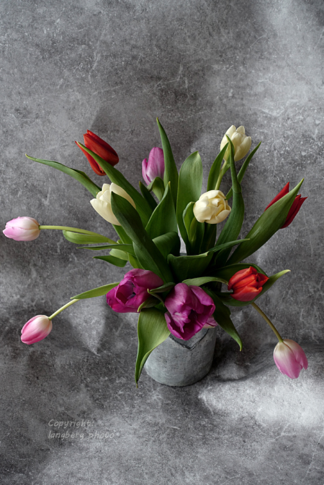 Ett av dem har jag lagt in på mitt P r i n t l e r galleri och de andra gjorde jag bara för skojs skull. Jag gör alltid flera stycken och sen väljer jag ut det som jag tycker blir bäst. Jag har även fotograferat dem som vanligt. När jag skapar mina stillében så använder jag mig av tapeter, eller tyg, som bakgrund. Till tulpanerna tyckte jag det blev snyggt med en betongliknande tapet. Men det är bara att låta fantasin skena iväg och prova sig fram. Huvudsaken är att man har roligt! 🙂