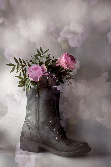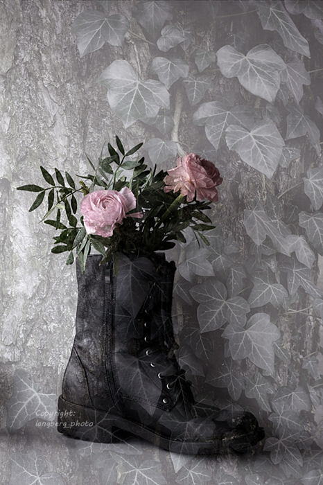 De här kängorna, ( ja, här är ju bara en av dem ) har jag gått långt i 🙂 De var så bekväma att gå i. Men allt har ju sin tid och till slut så gick det inte längre att använda dem. De började spricka och sulan lossnade så jag blev blöt om fötterna när det var blött ute. Så då var det väl dags att slänga dem. Men innan jag gjorde det så använde jag den ena till att skapa ett blomsterstillében av. Lite återanvändning kan man väl säga. De är ju i alla fall förevigade på bild och jag kan alltid minnas hur sköna de var att gå i 🙂
