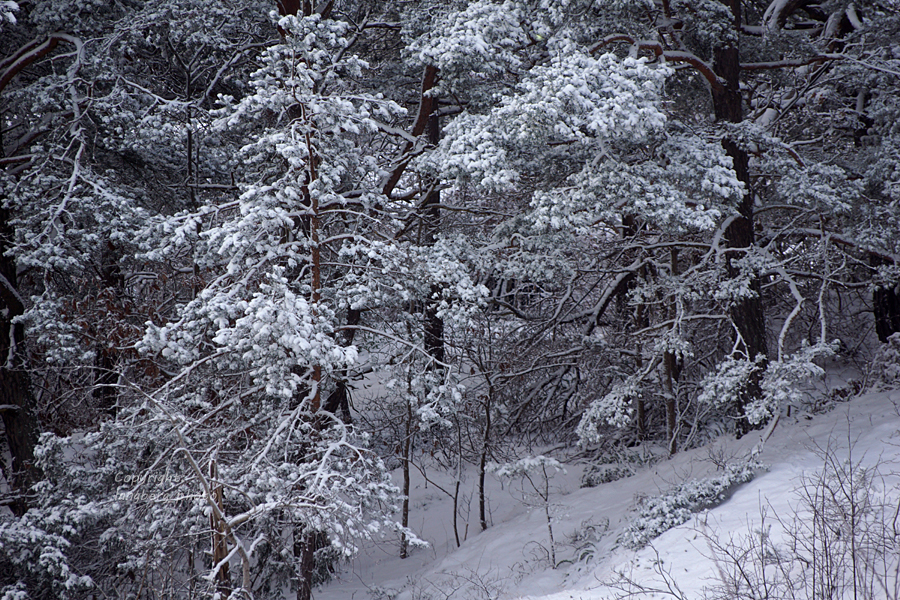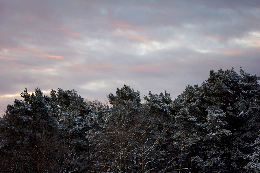 Vacker himmelHär börjar den rosa färgen försvinnaBerget mitt emot balkongenMycket snöSnön ligger kvar på trädets grenar. Igår kväll kom det en kraftig snöby, utan blåst, så snön blev kvar på träden.