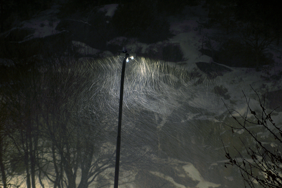 Den 1 dec hade vi ett riktigt snöväder här. Hela eftermiddagen och hela kvällen snöade det. Och blåste. Då roade jag mig med att försöka fånga hur snön yrde.