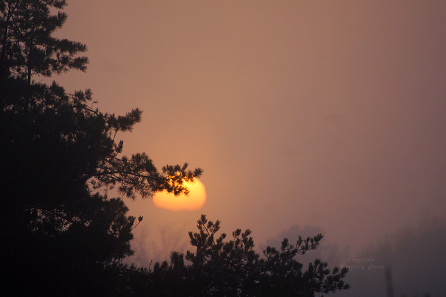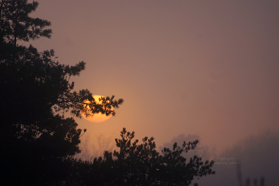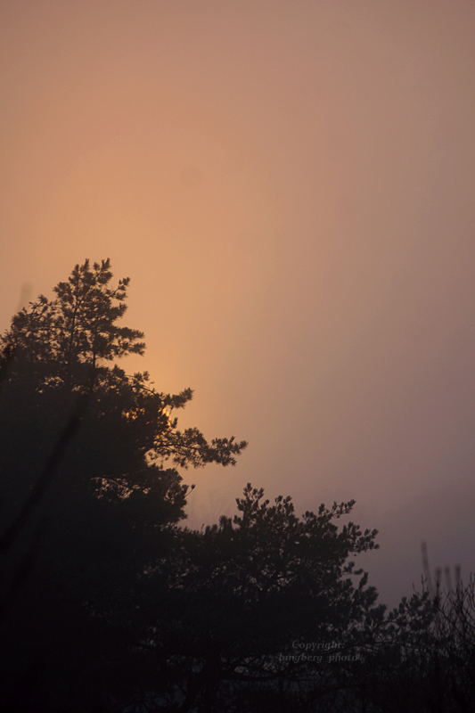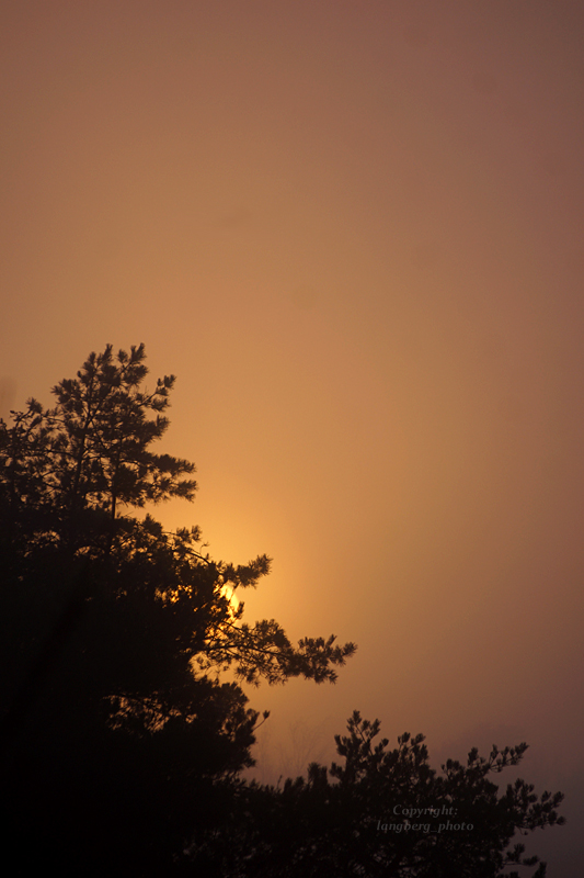 Här börjar solen skymta fram bakom tallenSolen syns lite merSolen bakom tallgrenenHär börjar solen sjunka ner i dimman igen
