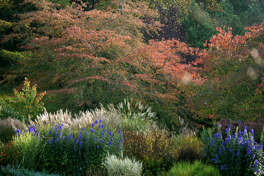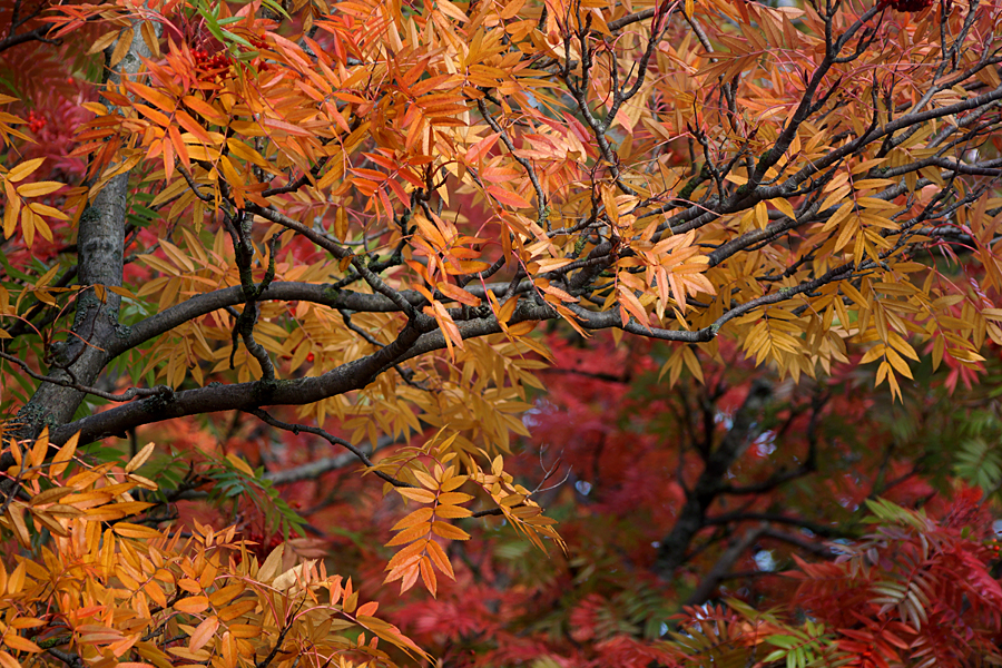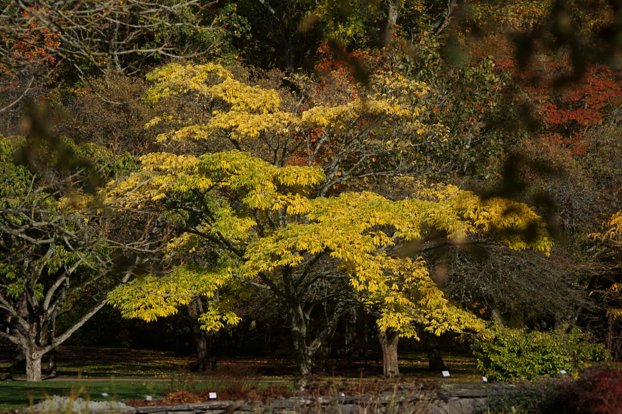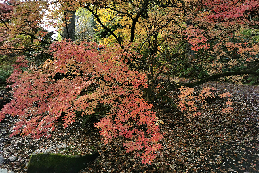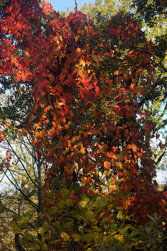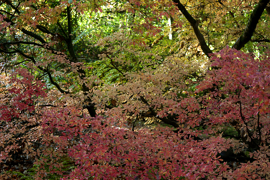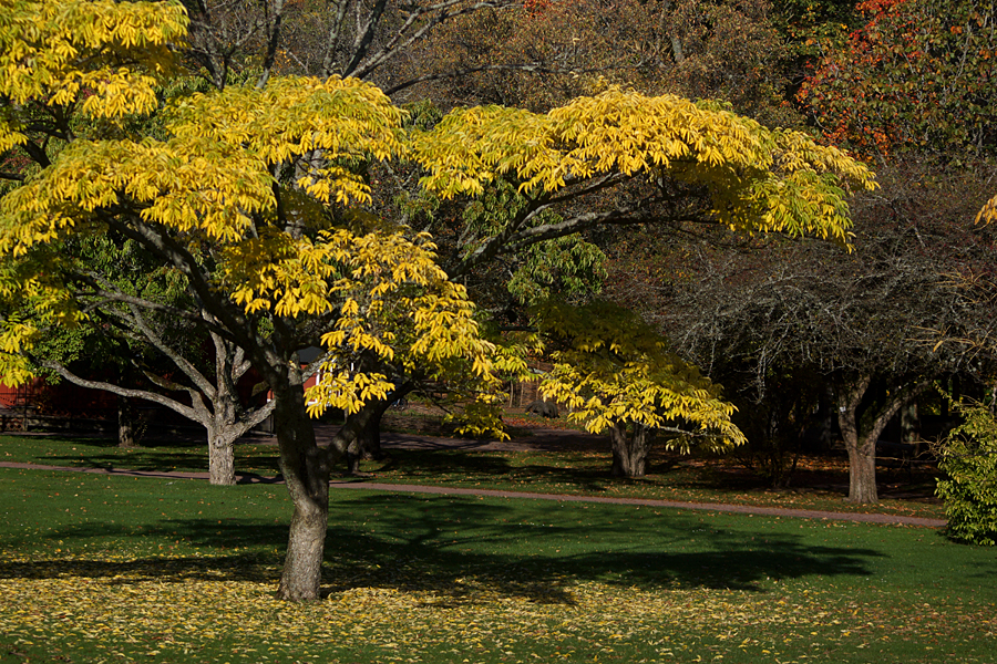 Det är fortfarande riktigt milda höstdagar och höstfärgerna blir lite tamare och blekare. Det där eldigt röda blir det inte så mycket med i det milda vädret. Och nu börjar löven falla till marken och snart står träden kala.