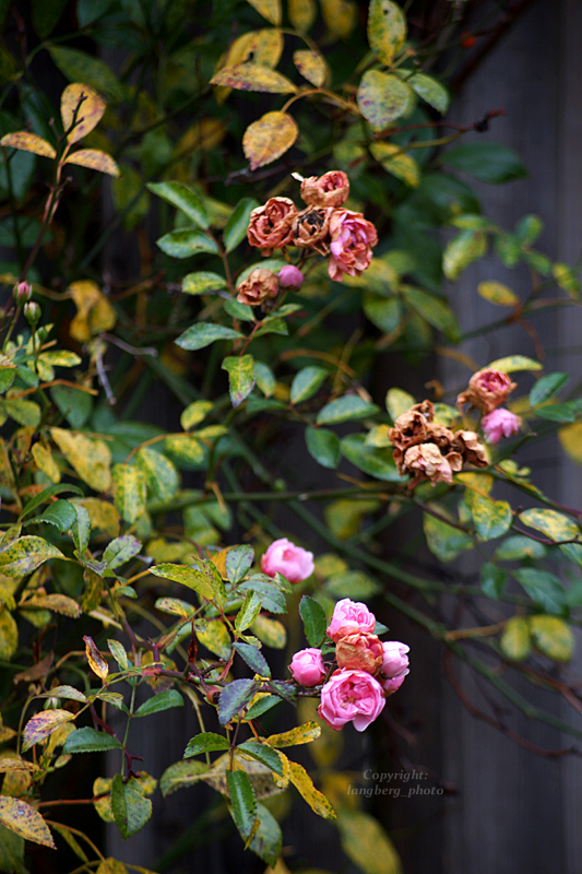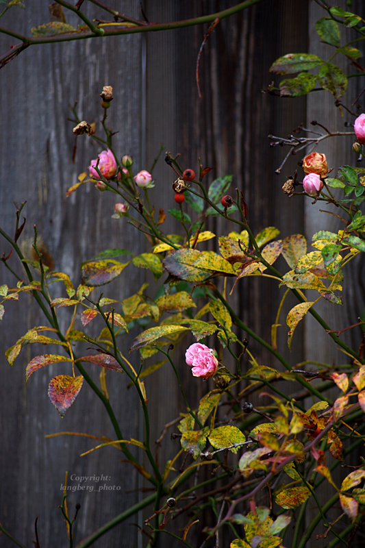 En promenad vid havet och förbi ett litet koloniområde på Smithska udden här i västra Göteborg. Grått och disigt och inte så mycket att fotografera. Bilder på havet blir ju bara så tråkigt gråa i det här vädret så jag blev så glad när jag fick syn på de här små rosorna som ännu kämpar på. Blommor är ju ett av mina favoritmotiv. 🙂