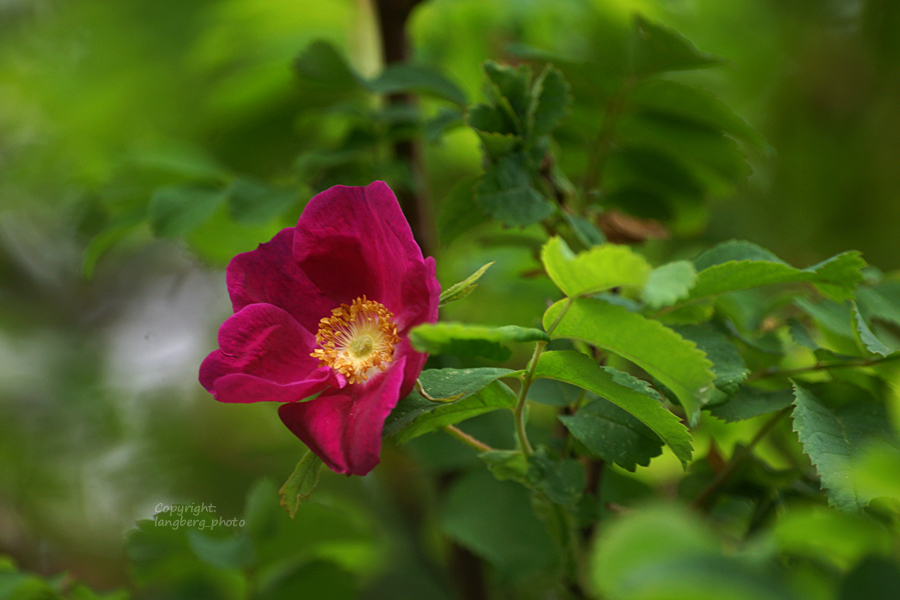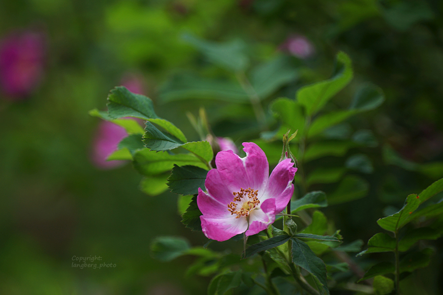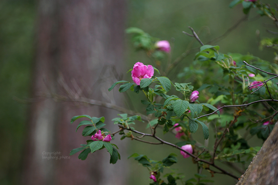 Lugnt och stilla vid AxlemossenNäckrosornas blad flyter omkring men här syntes inga blommor ännu.Vildrosorna blommarOch här sticker en del av vildrosbusken fram bakom en sten.En annan vildros med lite mörkare färgDet finns också en lund med Japanska lönnar i Änggårdsbergen och de har så vackra blad. På hösten blir de härligt röda.En ensam Azalea står i skogen alldeles intill gångstigen.En ”elefant” i skogen med små söta blommor runt sin fot……Och alla granar är fulla med små nya ljusgröna skott, alldeles mjuka när man känner på dem.