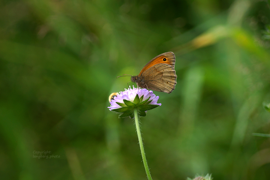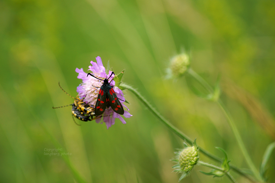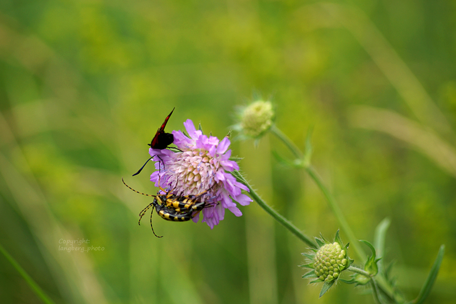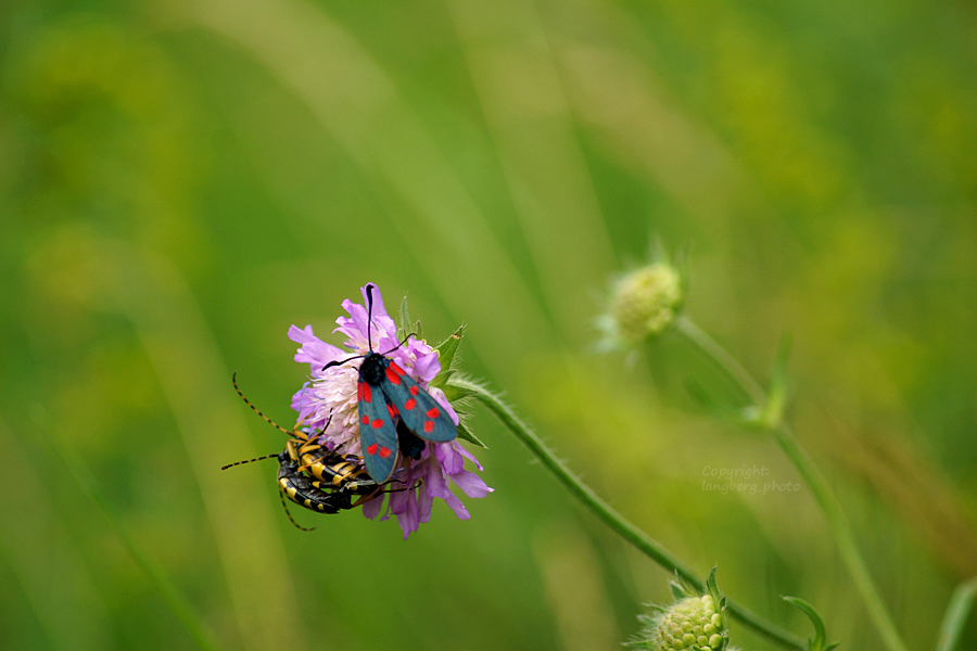 Här samsades Bastardsvärmaren med två baggar som jag tror kan vara Blombaggar.Baggarna satt i en något svår fotovinkel. En Kamgräsfjäril syntes också.
