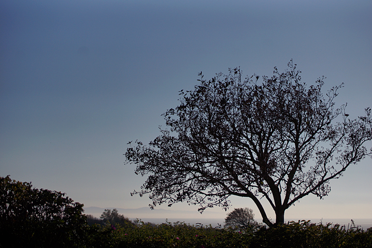 Det här trädet står vid vår tomtgräns och i bakgrunden skymtar Kullaberg i diset.