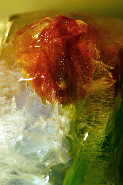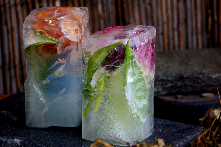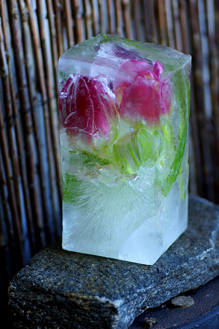 Så jag fick istället lägga in dem i frysen. Men då var jag tvungen att kapa kartongerna för att kunna ha dem stående medan de fryser. Inte helt lyckat, för blommorna hamnar ju då väldigt högt upp och ser avklippta ut. Men ändå kul att testa. Nästa gång ska jag prova med några blommor som är mindre. Penséer tex, kan nog bli fint. Detta kan man ju göra när som helst om man har en frys. Är det varmt ute så får man ju skynda sig att fota, förstås, innan konstverket smälter bort. 😀